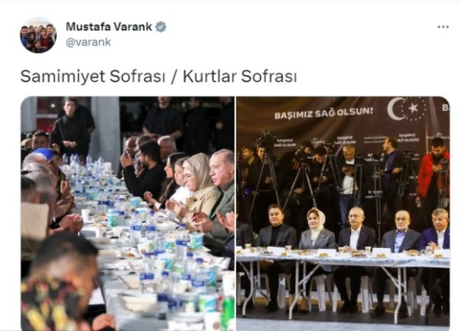Varank sosyal medya hesabından Cumhurbaşkanı ve AK Parti Genel Başkanı Recep Tayyip Erdoğan'ın Hatay'da Millet İttifakı liderlerinin ise Malatya'da depremzedelerle bir araya geldiği iftar yemeklerinden iki fotoğraf paylaştı.