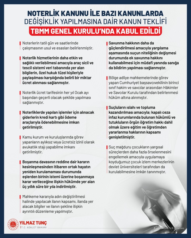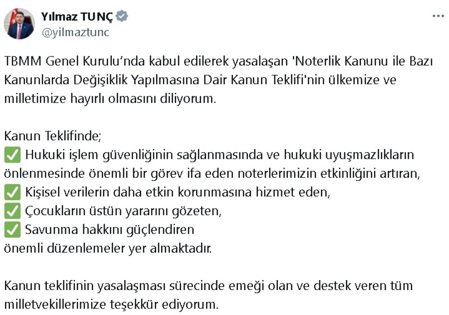 Bakan Tunç, sosyal medya hesabından yaptığı paylaşımda, kanun teklifi ile yapılan düzenlemeler hakkında bilgi verdi. Tunç, TBMM Genel Kurulu'nda kabul edilerek yasalaşan 'Noterlik Kanunu ile Bazı Kanunlarda Değişiklik Yapılmasına Dair Kanun Teklifi'nin ülkemize ve milletimize hayırlı olmasını diliyorum.