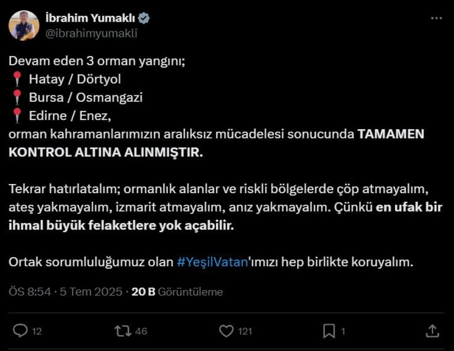 Tarım ve Orman Bakanı İbrahim Yumaklı, sosyal medya hesabından yaptığı açıklamada, "Devam eden 3 orman yangını; Hatay / Dörtyol Bursa / Osmangazi Edirne / Enez, orman kahramanlarımızın aralıksız mücadelesi sonucunda tamamen kontrol altına alınmıştır. Tekrar hatırlatalım; ormanlık alanlar ve riskli bölgelerde çöp atmayalım, ateş yakmayalım, izmarit atmayalım, anız yakmayalım. Çünkü en ufak bir ihmal büyük felaketlere yok açabilir. Ortak sorumluluğumuz olan #YeşilVatan'ımızı hep birlikte koruyalım" dedi.