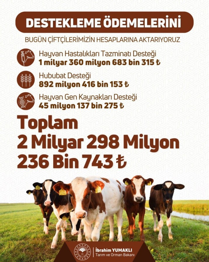 "Üreticimizin emeğine destek, üretime güç olmaya devam ediyoruz. 2 milyar 298 milyon 236 bin TL destekleme ödemesini bugün çiftçilerimizin hesaplarına aktarıyoruz. Hayırlı ve bereketli olsun."
