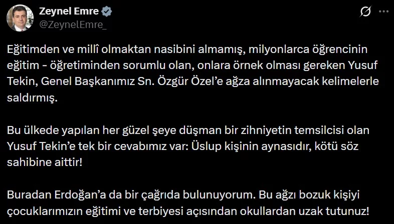 Emre, sosyal medya hesabından yaptığı açıklamada, "Eğitimden ve millî olmaktan nasibini almamış, milyonlarca öğrencinin eğitim - öğretiminden sorumlu olan, onlara örnek olması gereken Yusuf Tekin, Genel Başkanımız Sn. Özgür Özel'e ağza alınmayacak kelimelerle saldırmış" ifadelerini kullandı.