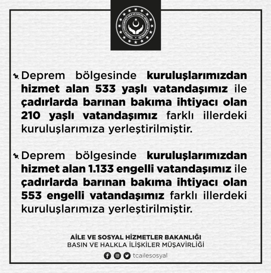 "Deprem bölgesinde kuruluşlarımızdan hizmet alan 533 yaşlı vatandaşımız ile çadırlarda barınan bakıma ihtiyacı olan 210 yaşlı vatandaşımız farklı illerdeki kuruluşlarımıza yerleştirilmiştir. Deprem bölgesinde kuruluşlarımızdan hizmet alan 1133 engelli vatandaşımız ile çadırlarda barınan bakıma ihtiyacı olan 553 engelli vatandaşımız farklı illerdeki kuruluşlarımıza yerleştirilmiştir."