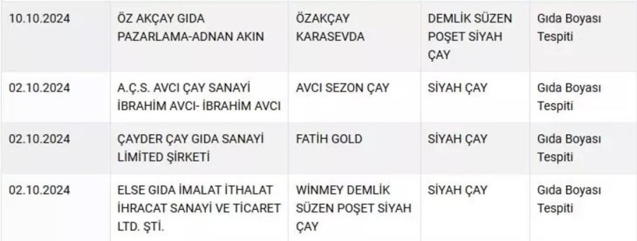 Listede yer alan 4 çay markasının ürünlerinde gıda boyası tespit edildi.