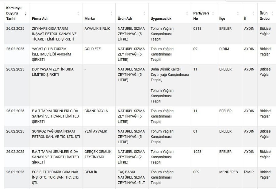 Son yapılan testlerde; zeytinyağı üretiminde daha düşük kaliteli yağ kullanımı ve peynir yapımında bitkisel yağ kullanımı tespit edildi.