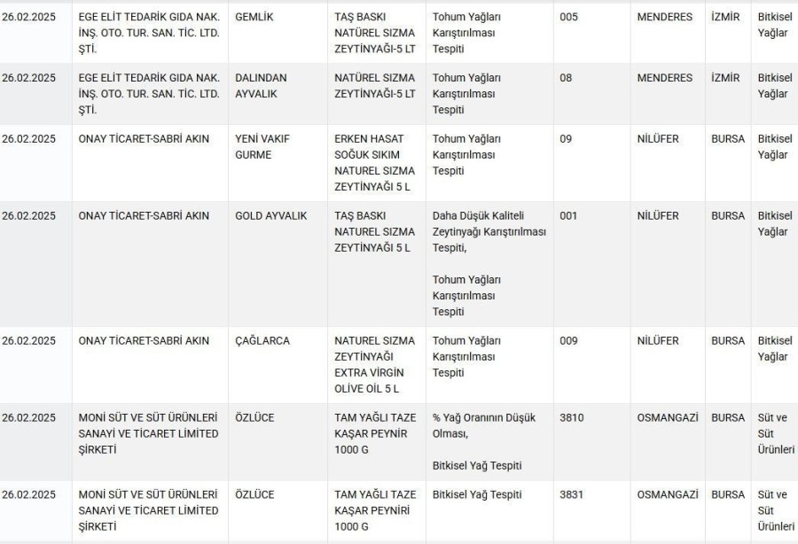 Tarım ve Orman Bakanlığı yaptığı denetimler kapsamında taklit ve tağşiş yapanlara ilişkin listesini her gün güncelliyor. Son yapılan testlerde sağlığı tehlikeye atacak şekilde tağşiş-taklit yapılan zeytinyağı ve peynir markaları ifşa edildi. Listede Bursalı iki marka da yer aldı.