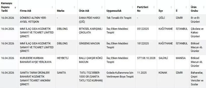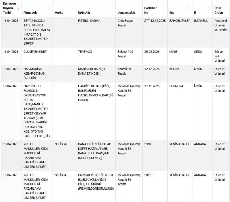 Listede İzmir'deki bir firmanın pide harcında 'tek tırnaklı eti' tespit edilirken, İstanbul'daki bir tatlıcının fıstıklı sarmasında ise 'boya' bulundu.