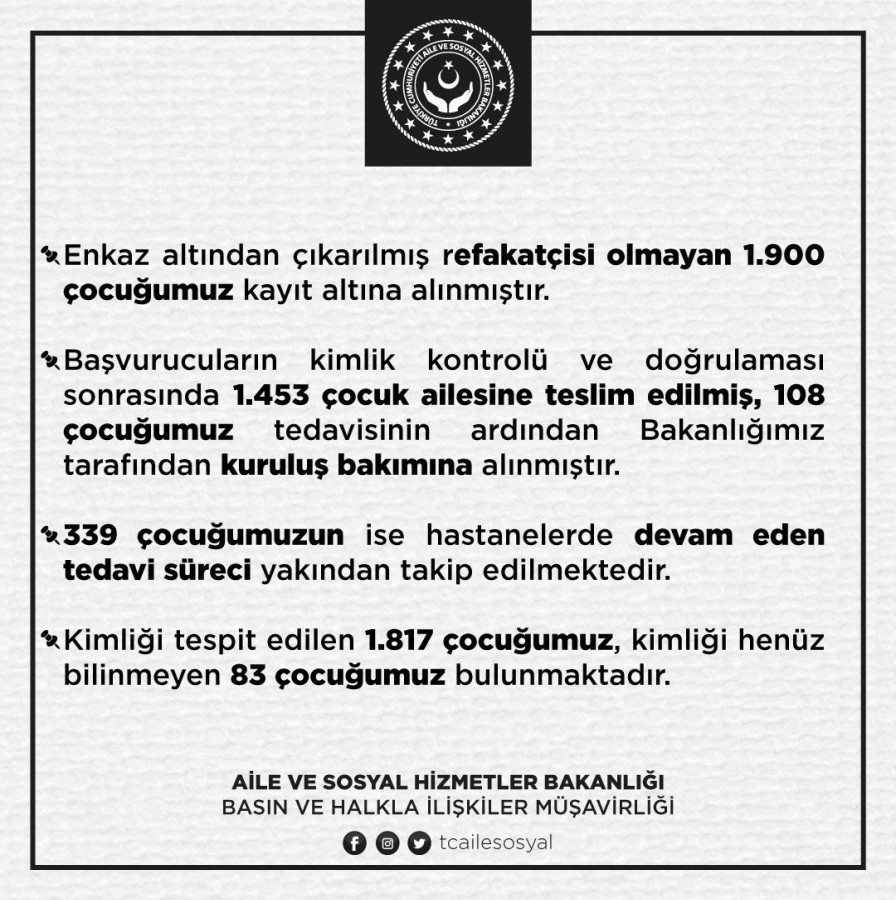 Aile ve Sosyal Hizmetler Bakanlığınca, enkaz altından çıkarılan refakatçisi olmayan 1900 çocuğun kayıt altına alındığı, başvurucuların kimlik kontrolü ve doğrulması sonrasında 1453 çocuğun ailesine teslim edildiği açıklandı.