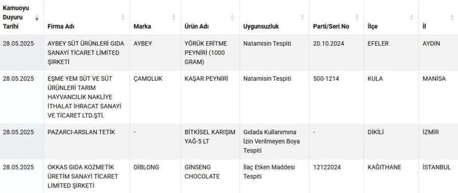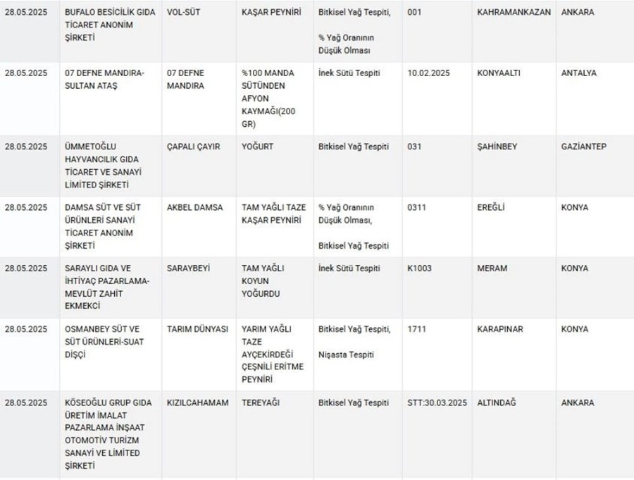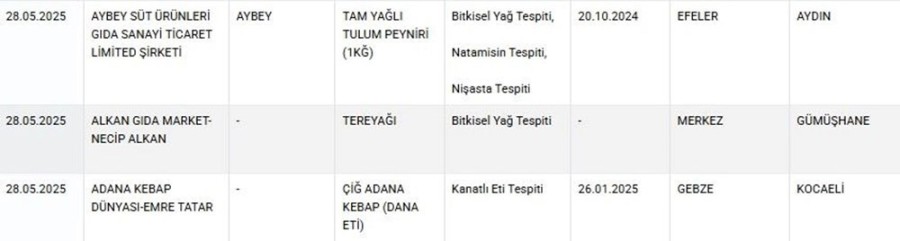 Son yapılan güncellemeyle birlikte yağ yerine boya, lahmacunda kanatlı eti, börekte hile gibi birçok ürün listeye dahil edildi ve üreticileri açıklandı.