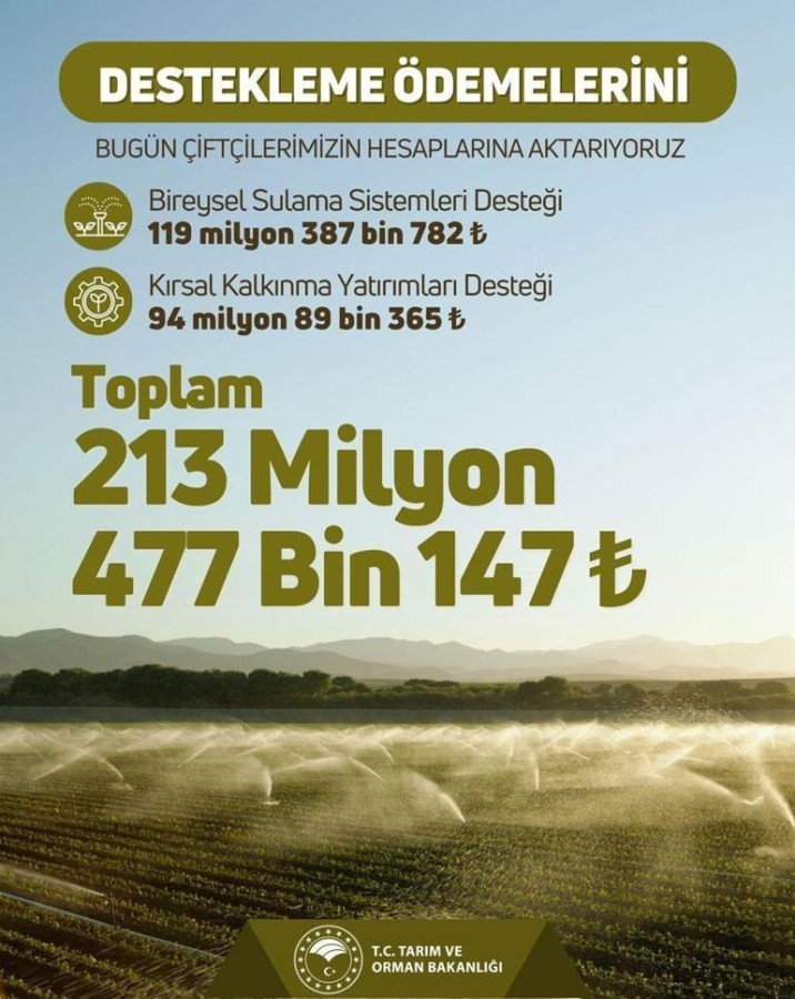 Bakanlığın sosyal medya hesabından yapılan açıklamada, bireysel sulama sistemleri desteği için 119 milyon 387 bin 782 TL, kırsal kalkınma yatırımları desteği kapsamında ise 94 milyon 89 bin 365 TL olmak üzere, toplamda 213 milyon 477 bin 147 TL tarımsal destekleme ödemesinin bugün çiftçilerin hesaplarına aktarılacağı bildirdi.