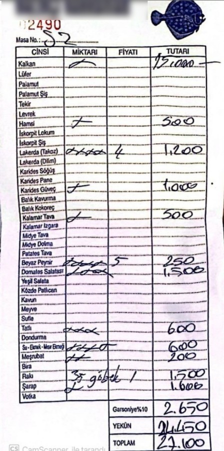 İstanbul'da ünlü bir balık restoranında gelen 27 bin 100 liralık adisyon görüntüsü sosyal medyada gündem oldu. Kilosu 1000-1500 TL arasında fiyatlara satılan kalkan balığı 15 bin lira ile adisyonun yarısından fazlasını kapladı.