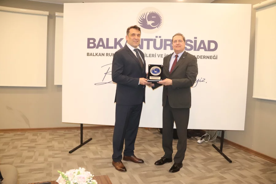 BALKANTÜRKSİAD Başkanı İskender İskenderoğlu, sunum sonrası, konuk konuşmacı I & D Danışmanlık Kurucusu ve Yönetim Danışmanı Deniz Yıldırım'a plaket takdiminde bulundu.