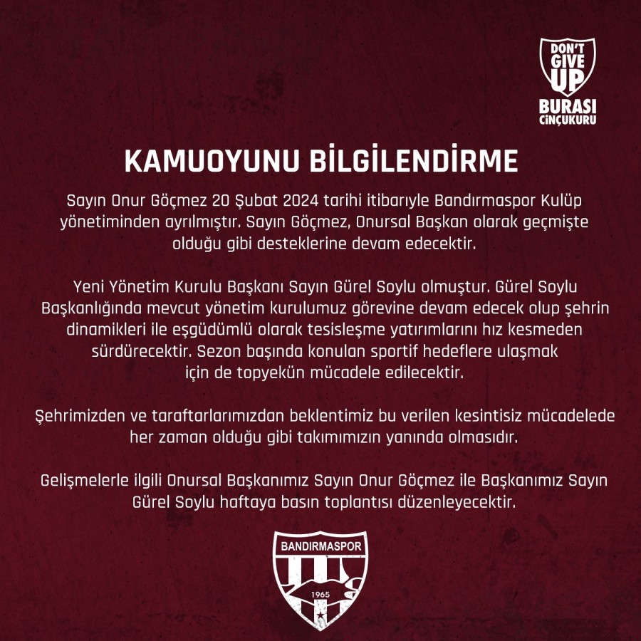 Bandırmaspor'un resmi sosyal medya hesapları üzerinden yapılan açıklamada, "Onur Göçmez, 20 Şubat 2024 tarihi itibariyle Bandırmaspor Kulüp yönetiminden ayrılmıştır. Göçmez, Onursal Başkan olarak geçmişte olduğu gibi desteklerine devam edecektir. Yeni Yönetim Kurulu Başkanı Sayın Gürel Soylu olmuştur. Gürel Soylu Başkanlığında mevcut yönetim kurulumuz görevine devam edecek olup şehrin dinamikleri ile eşgüdümlü olarak tesisleşme yatırımlarını hız kesmeden sürdürecektir. Sezon başında konulan sportif hedeflere ulaşmak için de topyekün mücadele edilecektir. Şehrimizden ve taraftarlarımızdan beklentimiz bu verilen kesintisiz mücadelede her zaman olduğu gibi takımımızın yanında olmasıdır. Gelişmelerle ilgili Onursal Başkanımız Onur Göçmez ile Başkanımız Sayın Gürel Soylu haftaya basın toplantısı düzenleyecektir" denildi.