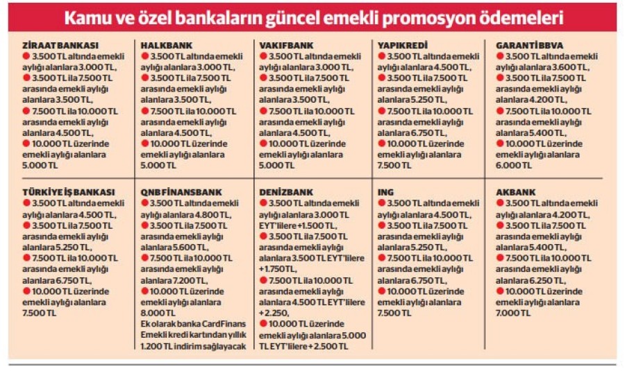 Dünya gazetesinden Birol Bozkurt'un haberine göre, bankalar 8 bin liraya kadar olan promosyonlarla ilgili çalışmalarını hızlandırdı. Kamu bankaları ve özel bankalar, banka promosyonları için çeşitli kampanyalar üzerinde çalışmaya başlarken ilk rakamlar da dillendirilmeye başlandı.