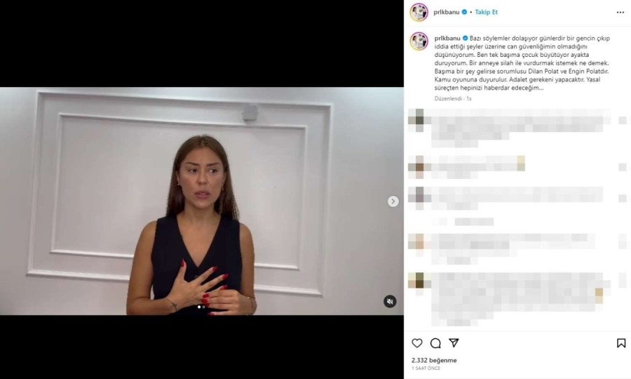 Sosyal medya hesabından açıklamalarda bulunan Sanatçı Banu Parlak, "Bazı söylemler dolaşıyor günlerdir bir gencin çıkıp iddia ettiği şeyler üzerine can güvenliğimin olmadığını düşünüyorum. Ben tek başıma çocuk büyütüyor ayakta duruyorum. Bir anneye silah ile vurdurmak istemek ne demek. Başıma bir şey gelirse sorumlusu Dilan Polat ve Engin Polat'tır. Kamu oyununa duyurulur. Adalet gerekeni yapacaktır. Yasal süreçten hepinizi haberdar edeceğim..." ifadelerinde bulundu.