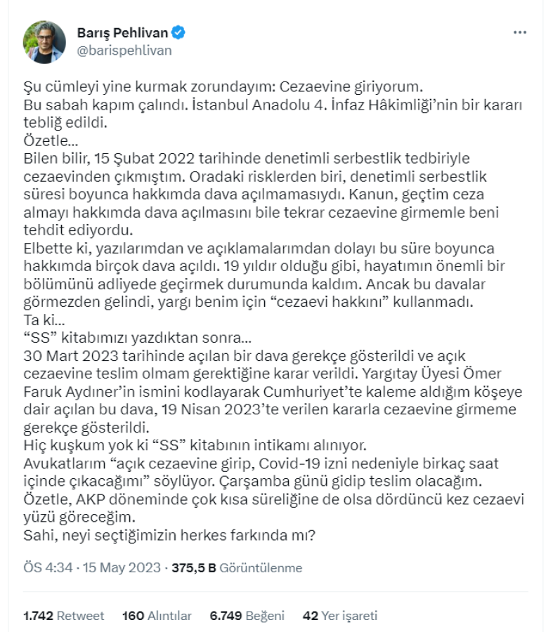 Gazeteci Barış Pehlivan yeniden cezaevine gireceğini duyurdu.