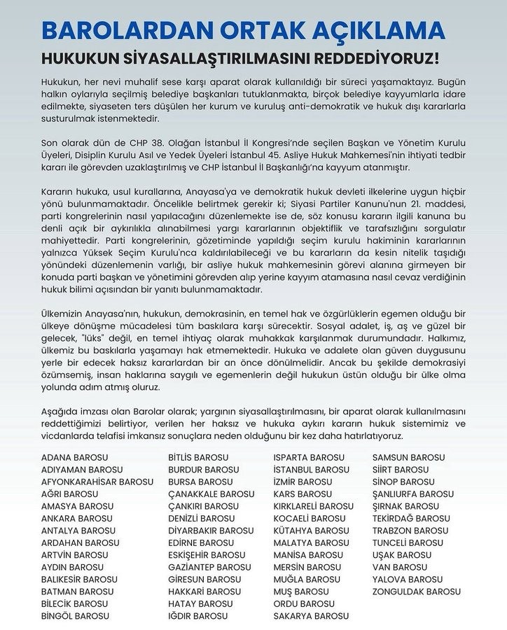 Barolar, İstanbul İl Başkanı Özgür Çelik ve İstanbul İl Yönetimi'nin görevden alınması ve yerine Gürsel Tekin'in kayyım olarak atanması hakkında açıklama yaptı. Kararın, "Anayasa'ya ve demokratik hukuk devleti ilkelerine uygun hiçbir yönü yok" diyen barolar, "Halkımız, ülkemiz bu baskılarla yaşamayı hak etmemektedir. Hukuka ve adalete olan güven duygusunu yerle bir edecek haksız kararlardan bir an önce dönülmelidir" ifadelerini kullandı.