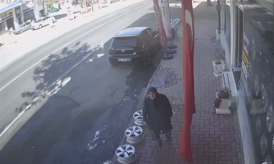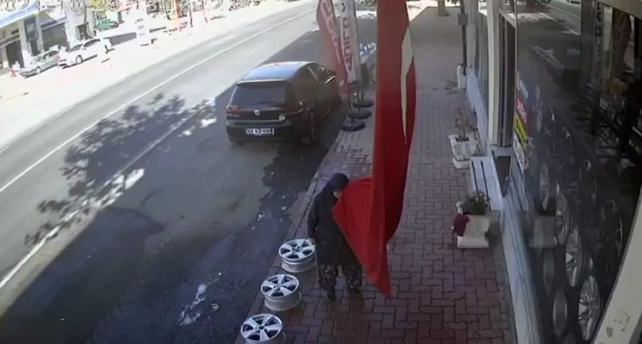 Aksaray'ın Ortahisar ilçesinde elinde bastonuyla kaldırımda yürüyen bir kadın, bir lastikçiye ait dükkanının önüne asılı olan Türk bayrağını görünce ilk önce durdu ve sonra öptü. O anlar iş yerinin güvenlik kamerasına yansıdı.