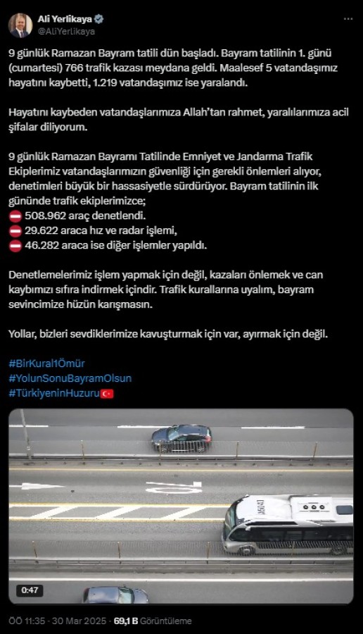 "9 günlük Ramazan Bayram tatili dün başladı. Bayram tatilinin 1. günü 766 trafik kazası meydana geldi. Maalesef 5 vatandaşımız hayatını kaybetti, 1.219 vatandaşımız ise yaralandı. Hayatını kaybeden vatandaşlarımıza Allah'tan rahmet, yaralılarımıza acil şifalar diliyorum. Denetlemelerimiz işlem yapmak için değil, kazaları önlemek ve can kaybımızı sıfıra indirmek içindir. Trafik kurallarına uyalım, bayram sevincimize hüzün karışmasın. Yollar, bizleri sevdiklerimize kavuşturmak için var, ayırmak için değil."