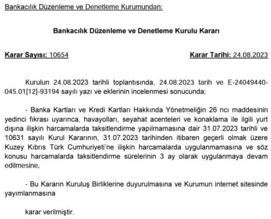 BDDK'dan yapılan açıklamada, "Banka Kartları ve Kredi Kartları Hakkında Yönetmeliğin 26'ncı maddesinin yedinci fıkrası uyarınca, havayolları, seyahat acenteleri ve konaklama ile ilgili yurt dışına ilişkin harcamalarda taksitlendirme yapılmamasına dair 31.07.2023 tarihli ve 10631 sayılı Kurul Kararının, 31.07.2023 tarihinden itibaren geçerli olmak üzere KKTC'ye ilişkin harcamalarda uygulanmamasına ve söz konusu harcamalarda taksitlendirme sürelerinin 3 ay olarak uygulanmaya devam edilmesine karar verildi" denildi.