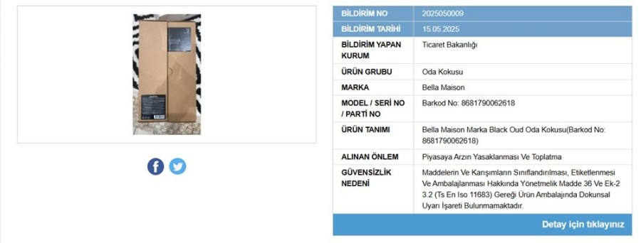Buna göre; "Bella Maison" marka "Black Oud" oda kokusunun piyasaya arzı yasaklandı, mevcut ürünlerin de toplatılması kararlaştırıldı.