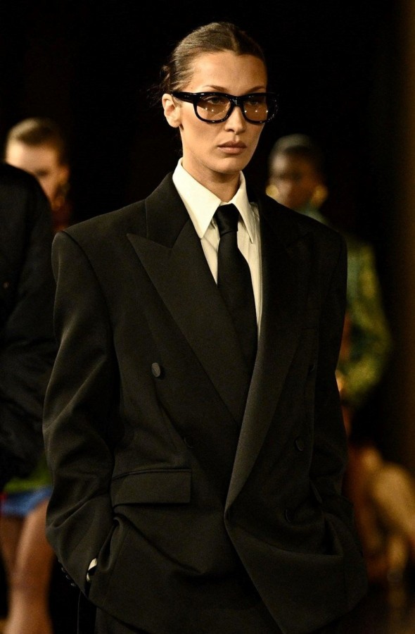 Maskülen bir stil ile podyumda boy gösteren Hadid, siyah bir takım elbise giydi. Hadid, son olarak 2022 Ekim'de bir defilede yürümüştü.