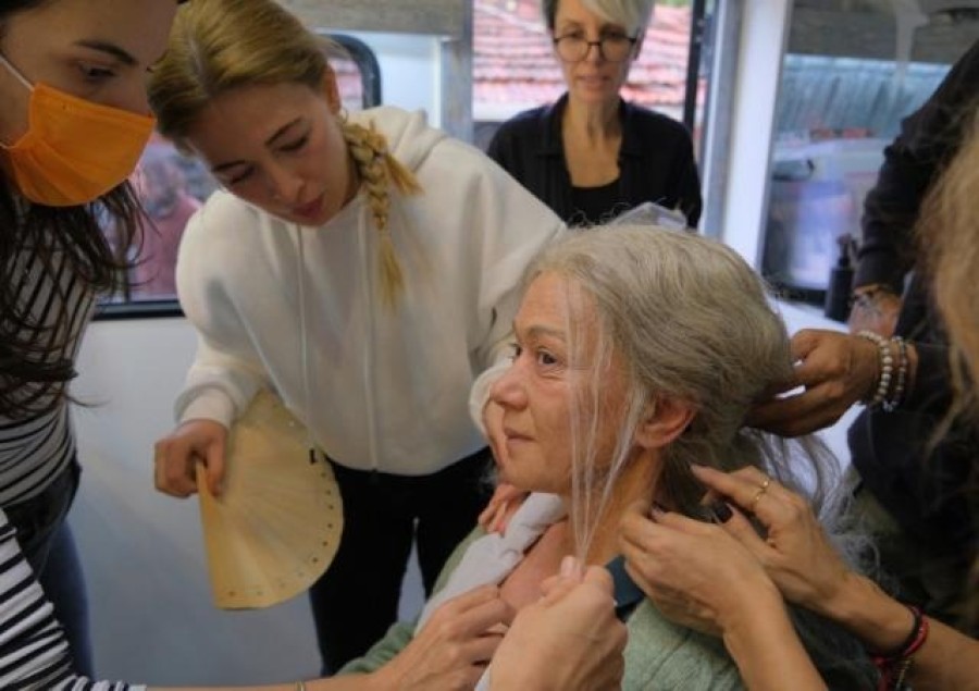 Yüz, el ve boynuna yapılan makyaj ile yaşlandırılan Bennu Yıldırımlar 4 saatte 25 yıl yaşlandırıldı.