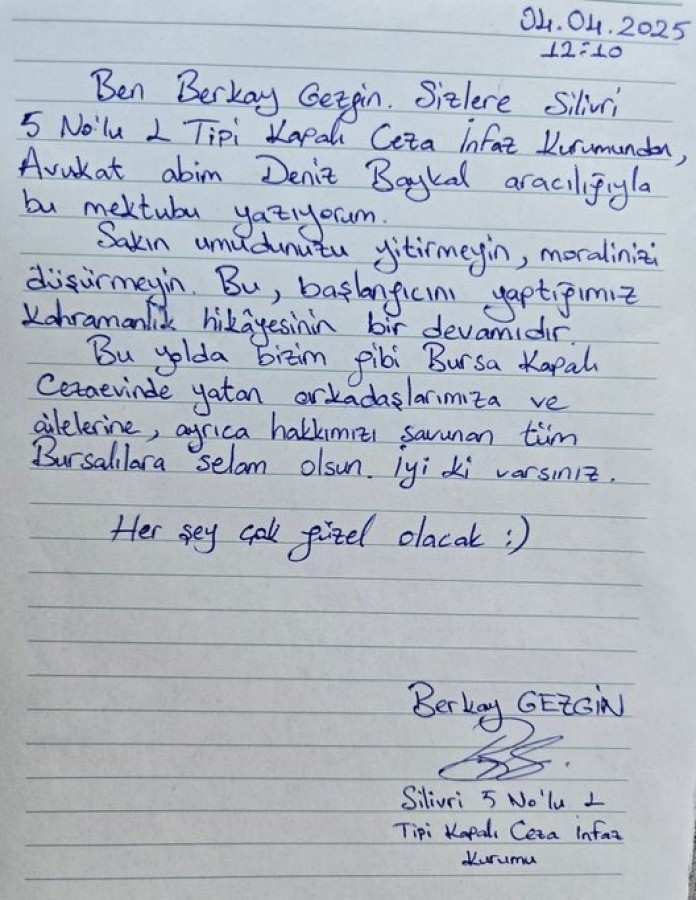 "Ben Berkay Gezgin, sizlere Silivri 5 Nolu L Tipi Kapalı Ceza İnfaz Kurumundan avukat abim Deniz Baykal aracılığıyla bu mektubu yazıyorum.