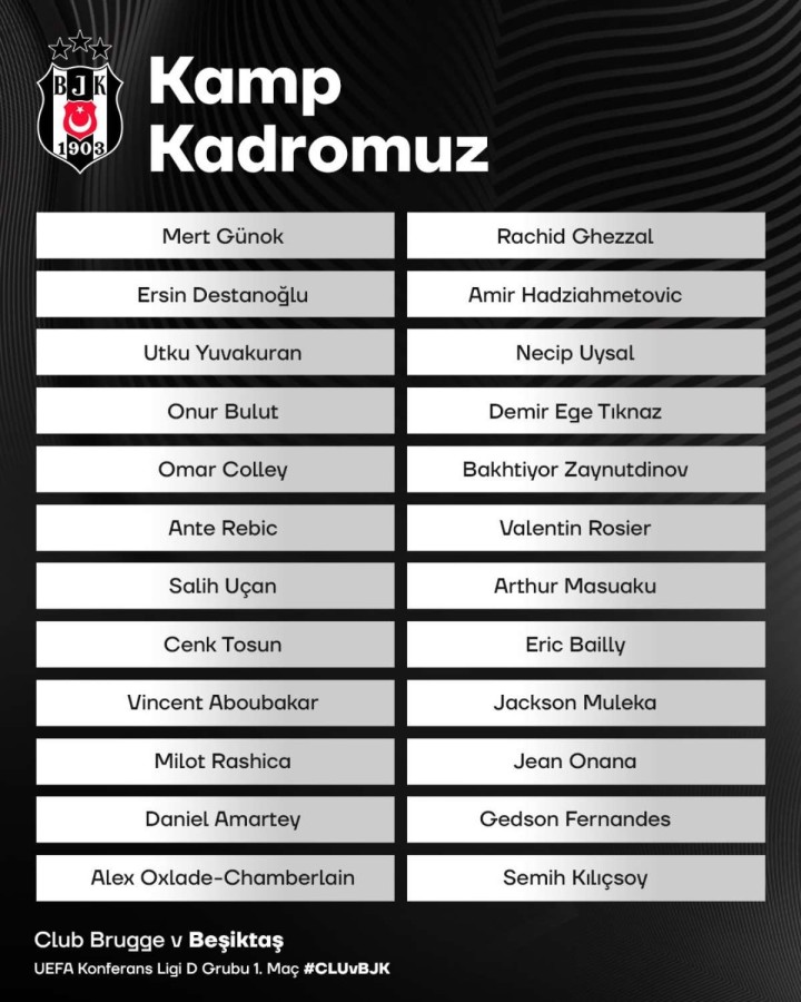 Beşiktaş, UEFA Avrupa Konferans Ligi D Grubu ilk maçında deplasmanda karşılaşacağı Club Brugge maçının kamp kadrosunu duyurdu.