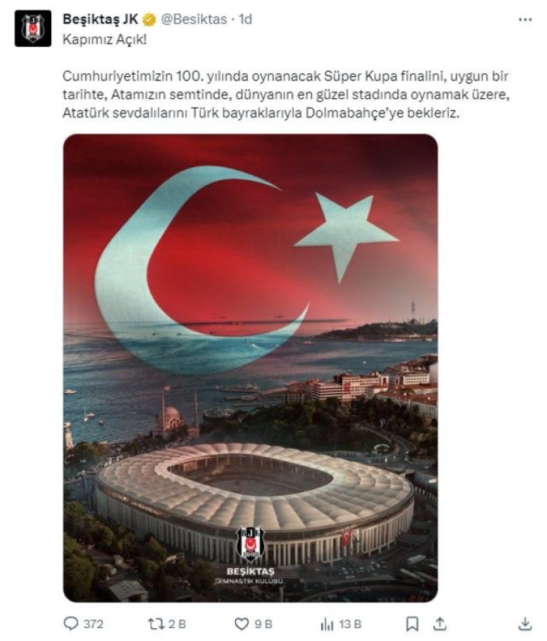 Suudi Arabistan'ın başkenti Riyad'ta, Galatasaray ile Fenerbahçe arasında oynanması beklenen Turkcell Süper Kupa maçı, bildirilen saatte başlamadı. Karşılaşma kısa süre içinde iptal edildi ve takımlarımız yurda dönmek için harekete geçti. Bu hamle sonrası Beşiktaş tarihi bir çağrıda bulundu.