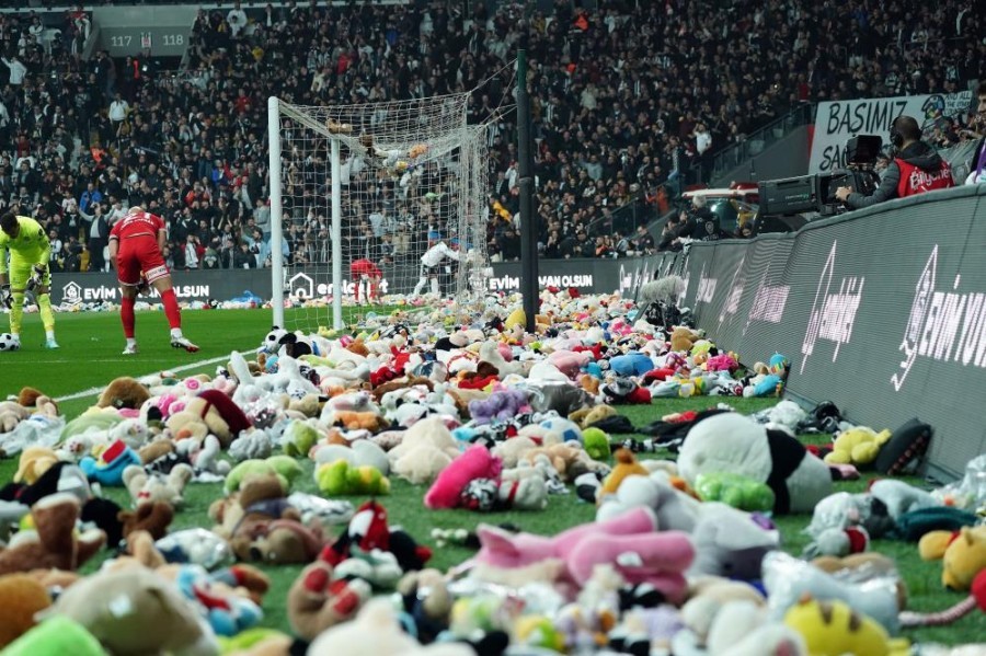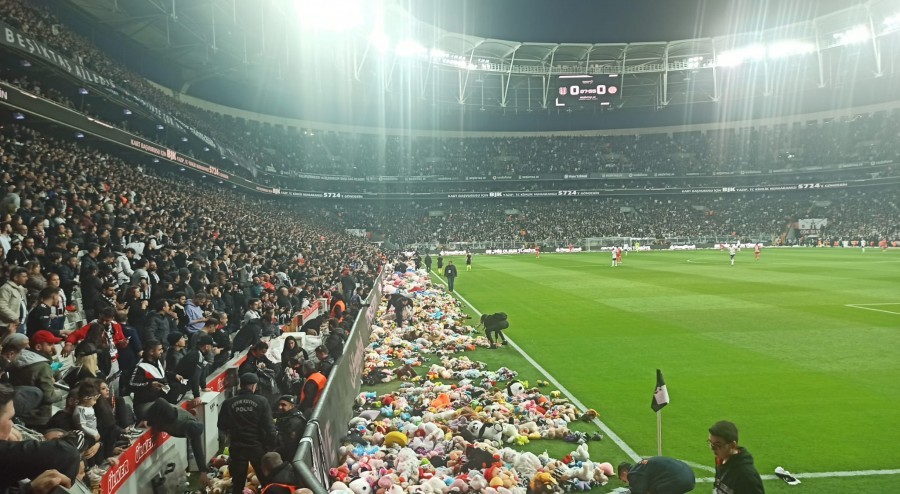 Bu akşam Beşiktaş - Antalyaspor süper lig maçında dakikalar ilk depremin yaşandığı saat olan 4.17 'yi gösterdiğinde binlerce Beşiktaş taraftarı yanlarında getirdiği oyuncakları depremzede çocuklara göndermek için sahaya attı.