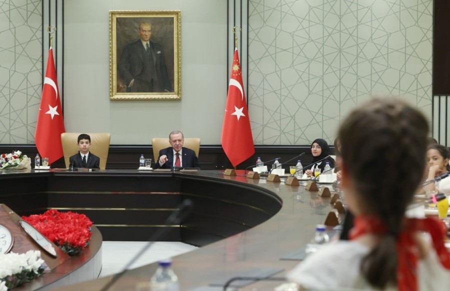 Beştepe'de kabine toplantısının gerçekleştiği salonda gerçekleşen kabulde, Cumhurbaşkanı Erdoğan çocuklarla bir süre sohbet etti.