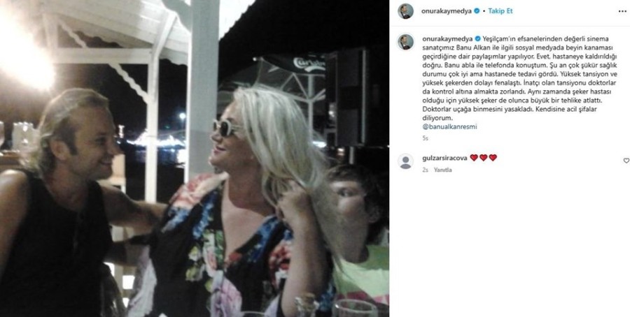 Onur Akay, sosyal medya hesabından yaptığı açıklamada, "Banu Alkan'ın hastaneye kaldırıldığı doğru ancak beyin kanaması geçirdiği iddiaları asılsız" ifadelerini kullandı. Akay, Alkan ile telefonda görüştüğünü belirterek şunları söyledi: "Banu ablanın sağlık durumu şu an çok şükür iyi. Doktorları tansiyon ve şeker seviyelerini kontrol altına almakta zorlandı ancak gerekli müdahalelerle tehlikeyi atlattı."