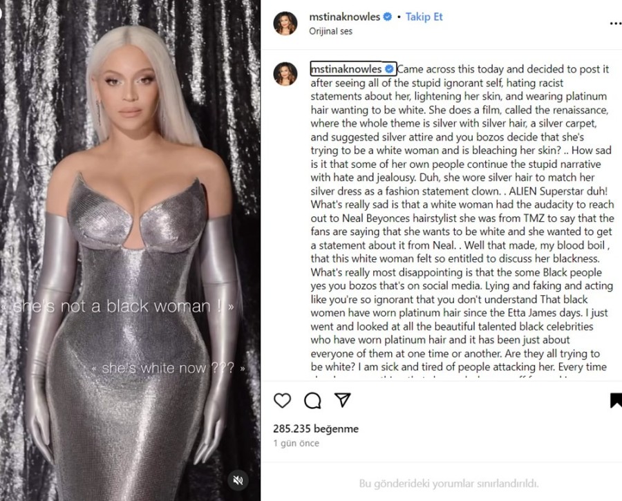 Bunun üzerine şarkıcının annesi Tina Knowles, kızının fotoğraflarını paylaşarak "İnsanların kızıma saldırmasından bıktım. Yaptığı her şey için çok çalışıyor" dedi.