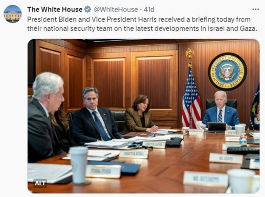 Fotoğrafa "Başkan Biden ve Başkan Yardımcısı Harris, bugün ulusal güvenlik ekibinden İsrail ve Gazze'deki son gelişmelere ilişkin bilgi aldı" notu düşüldü.