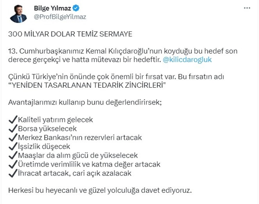 "300 MİLYAR DOLAR TEMİZ SERMAYE 13. Cumhurbaşkanımız Kemal Kılıçdaroğlu'nun koyduğu bu hedef son derece gerçekçi ve hatta mütevazı bir hedeftir.