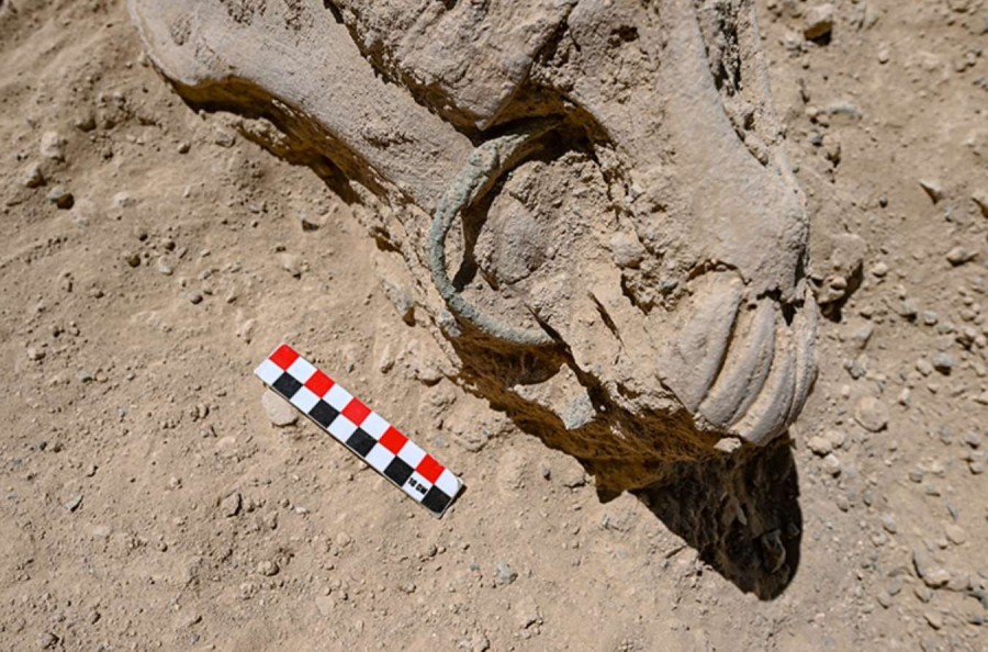 Geçen yıl Urartu yönetici sınıfına ait olduğu değerlendirilen iskeletin ortaya çıkarıldığı noktada, bu sene de çenesinde bronz gem (binek hayvanını yönlendirmek için ağzının içine takılan metal parça) olan at iskeleti bulundu.