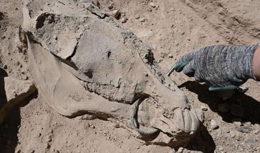 Van'da Urartular döneminde inşa edilen Çavuştepe Kalesi'nin kuzeyindeki nekropol alanında çenesinde bronz gem olan at iskeleti ortaya çıkarıldı.