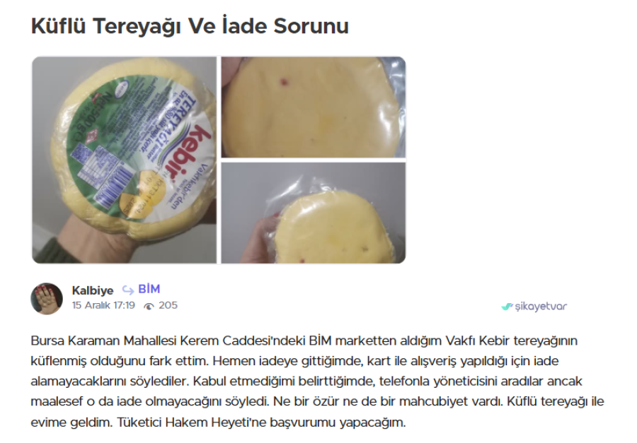 Ne bir özür ne de bir mahcubiyet vardı diyen mağdur vatandaş, "Küflü tereyağı ile evime geldim. Tüketici Hakem Heyeti'ne başvurumu yapacağım" dedi.