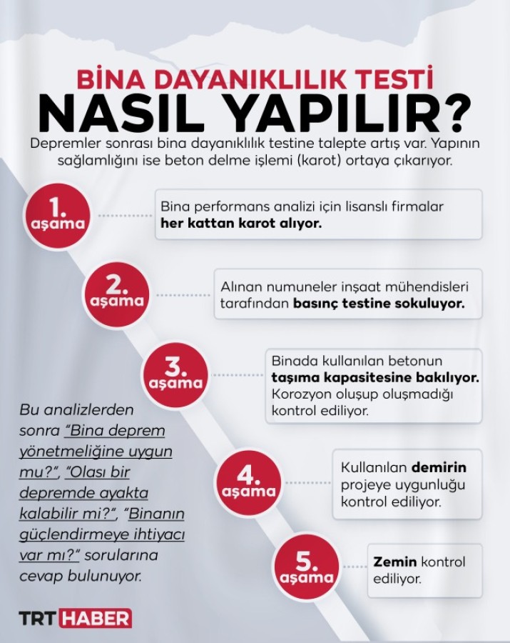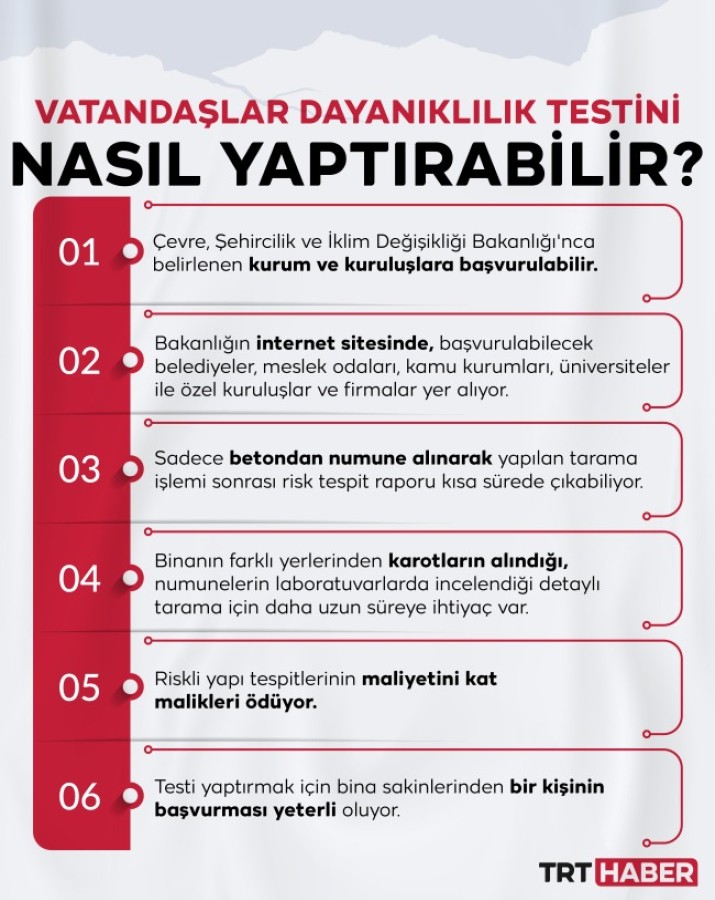 Binasının riskli olduğunu düşünen veya depreme karşı dayanıklı olup olmadığını öğrenmek isteyenler, Çevre, Şehircilik ve İklim Değişikliği Bakanlığı'nca belirlenen kurum ve kuruluşlara başvurarak bu testi yaptırabiliyor.