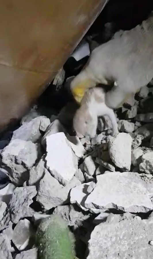 Hatay'ın Hassa ilçesinde girdiği, depremde yıkılan binanın enkazında doğum yapan kedinin 3 yavrusu, çevredeki bir vatandaş tarafından moloz yığınlarının altından sağ çıkarıldı.