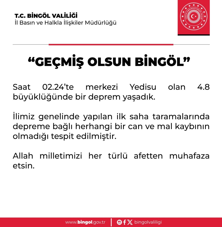 Bingöl Valiliği'nden yapılan açıklamada, ilk belirlemelere göre herhangi bir can veya mal kaybının olmadığı ifade edildi: