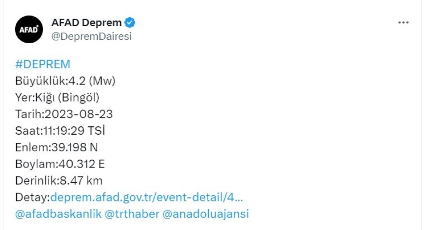 AFAD verilerine göre; Bingöl Kığı'da, saat 11.19'da, 4,2 büyüklüğünde deprem meydana geldi.