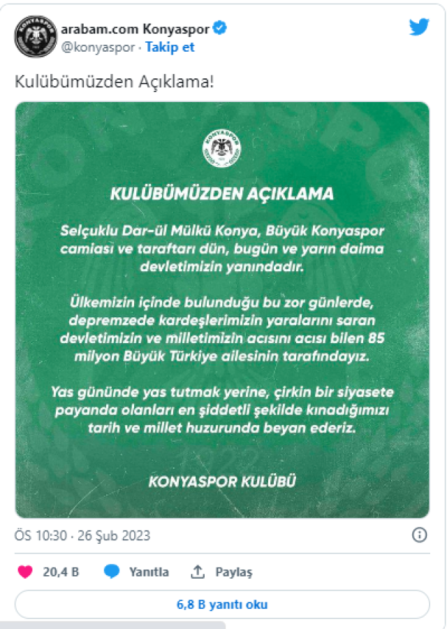 Konyaspor'un resmi Twitter hesabından yapılan açıklamada; "Yas gününde yas tutmak yerine çirkin bir siyasete payanda olanları en şiddetli şekilde kınadığımızı tarih ve millet huzurunda beyan ederiz" ifadelerine yer verildi.
