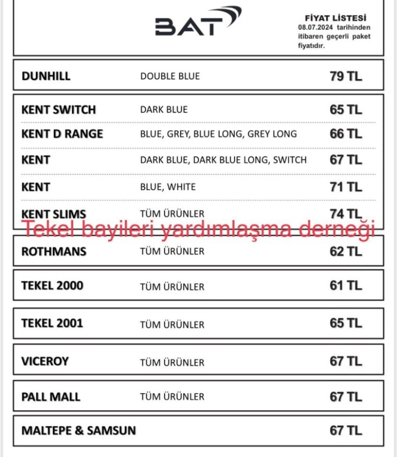 Tekel Bayileri Yardımlaşma Derneği (TBYD) Başkanı Erol Dündar, British American Tobacco'nun (BAT) yeni fiyat listesini paylaştı.