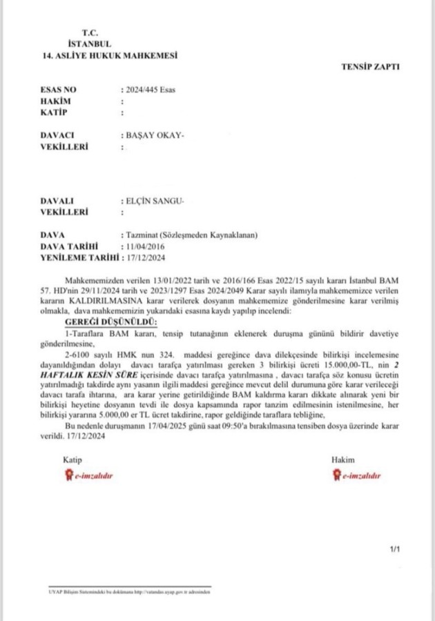 ünlü oyuncu Elçin Sangu gazeteci Birsen Altuntaş'a yanıt olarak 8 yıldır uğraştığı davaya dair belgeleri paylaştı. Sangu'nun paylaşımı şu şekilde: