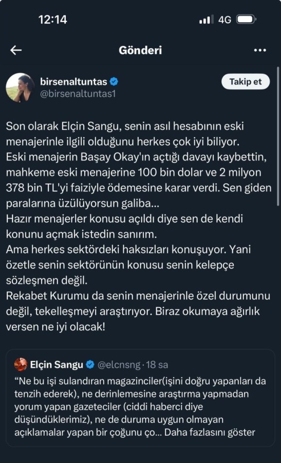 Rekabet Kurulu'nun yapımcılar ve menajerlik şirketleri hakkında başlattığı soruşturmanın yankıları devam ederken, sosyal medyada başlayan tartışmalar gündem yaratmaya devam ediyor. Ünlü oyuncu Elçin Sangu, konuyla ilgili yaptığı paylaşımlarla dikkat çekerken, gazeteci Birsen Altuntaş ile yaşadığı karşılıklı atışmalar gündemin öne çıkan başlıklarından biri oldu.
