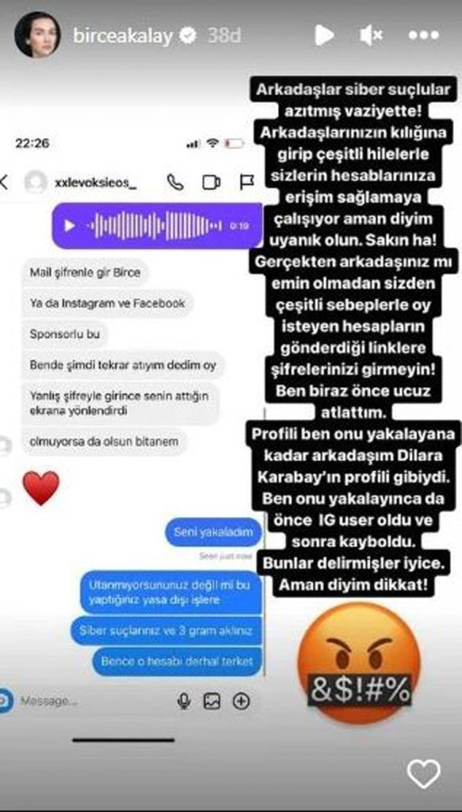 Sosyal medya üzerinden kendisini arkadaşı olarak tanıtan bir siber suçlu tarafından dolandırılmaktan kıl payı kurtulan oyuncu Birce Akalay, takipçilerine uyarıda bulundu.