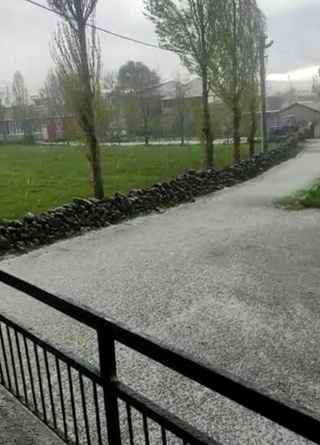 Bitlis'in Güroymak ilçesine bağlı Gölbaşı beldesinde ceviz büyüklüğündeki dolu beldeyi beyaza bürüdü.