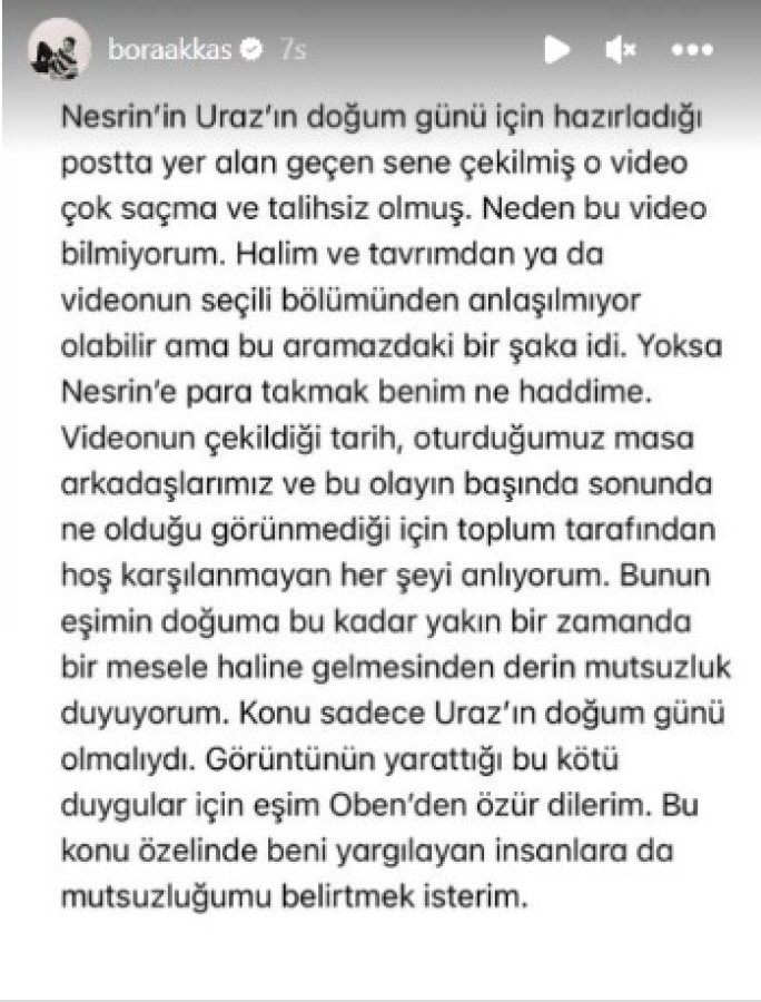 "Nesrin'in Uraz'ın doğum günü için hazırladığı postta yer alan geçen sene çekilmiş o video çok saçma ve talihsiz olmuş. Neden bu video bilmiyorum. Halim ve tavrımdan ya da videonun seçili bölümünden anlaşılmıyor olabilir ama bu aramızdaki bir şaka idi. Yoksa Nesrin'e para takmak benim ne haddime.