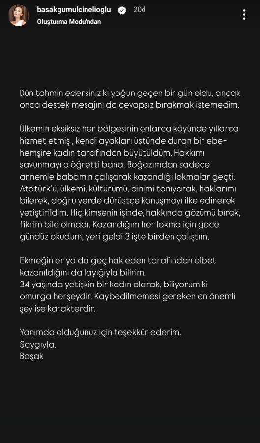 Sosyal medya hesabından boykot çağrısı yapan ve TRT'ye bağlı TABİİ Platformunda rol alacağı Muhabir adlı dizinin kadrosundan çıkartılan Gümülcinelioğlu, sosyal medya hesabından dikkat çekici bir paylaşım yaptı. "Atatürk'ü, ülkemi, kültürümü, dinimi tanıyarak, haklarımı bilerek, doğru yerde dürüstçe konuşmayı ilke edinerek yetiştirildim. Ekmeğin er ya da geç hak eden tarafından elbet kazanıldığını da layığıyla bilirim" diye yazan Gümülcinelioğlu, takipçilerine destek mesajları için teşekkür etti.